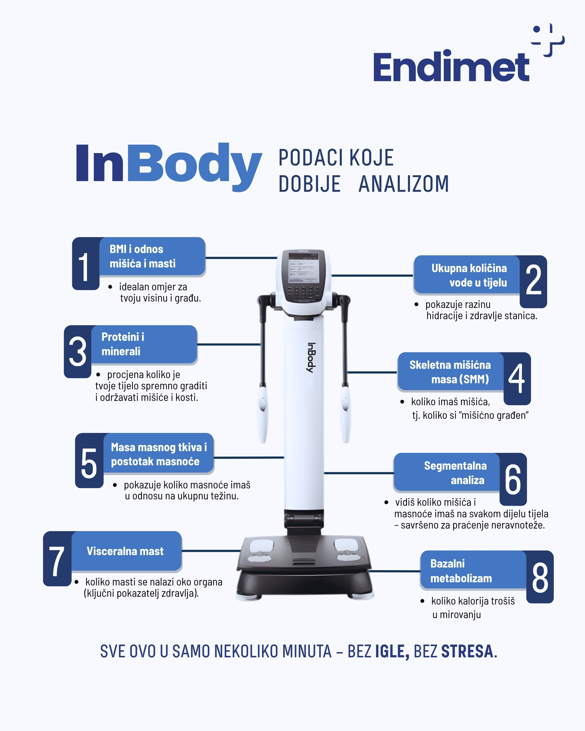 U poliklinici Endimet koristimo In body 270 analizator sastava tijela. InBody analizatori tjelesne masti poznati su po svojoj točnosti i preciznosti i predstavljaju zlatni standard analize sastava tijela, potvrđeni u brojnim kliničkih studijama.